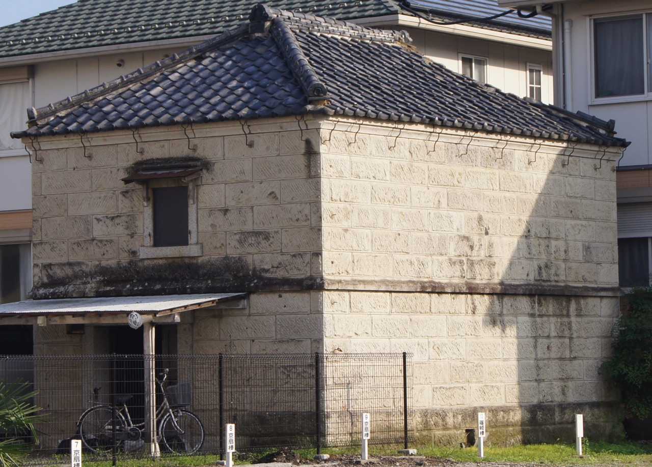 尚、この石塀の向いは磯蔵酒造です。この造り酒屋さんの蔵も凝灰岩で築かれています。蔵の建築年代は大正期以前に遡る可能性がありますが、石材については、大谷でも、茂木でも無い様に考えていますので、もう少し検証してからご案内します。