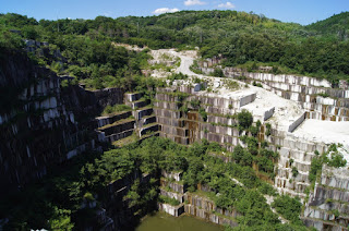 旧採掘場を見下ろす崖の上では、ストーンフェスティバル出典作品が展示されています。岩の表面仕上げにより質感や色が変化してみえるので興味深い場所です。2009年に見学した時はここで三々五々、昼食を摂りました。